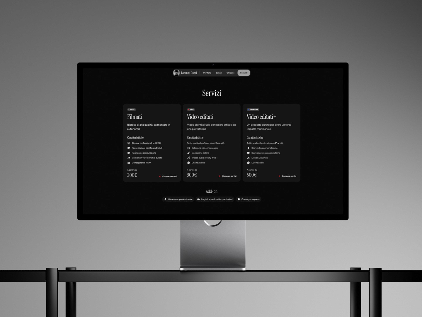 Il sito web di Lorenzo è immersivo e a sfondo nero, con titoli in un font serif compatto, classico ma moderno, per dare quel senso premium ad alta personalizzazione che contraddistingue il suo approccio. Il corpo del testo invece ritorna su un font sans per sottolineare l'aspetto professionale e tecnologico, anche ripreso da un'interfaccia pulita e amichevole, che fa ampio uso dello squircle per stondare gli angoli. Dotato di CMS, questo sito è anche un portfolio che permette a Lorenzo di caricare i suoi lavori migliori in modo semplice e veloce. Fun fact: i pulsanti principali hanno una luce rossa lampeggiante per ricordare quella delle videocamere quando si registra, il che si ricollega con il fatto che Lorenzo è videomaker.